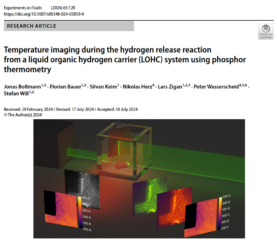 Liquid organic hydrogen carrier systems (LOHC) are a promising option for chemical hydrogen storage. In order to characterize the endothermic hydrogen release from the carrier liquid, it is important to know the temperature fields during dehydrogenation. In this work, phosphor thermometry was used for the first time as an imaging measurement method, utilizing both the temporal decay signal and the spectral shift of the phosphorescence. This made it possible to demonstrate significant cooling, particularly in areas close to the catalyst.